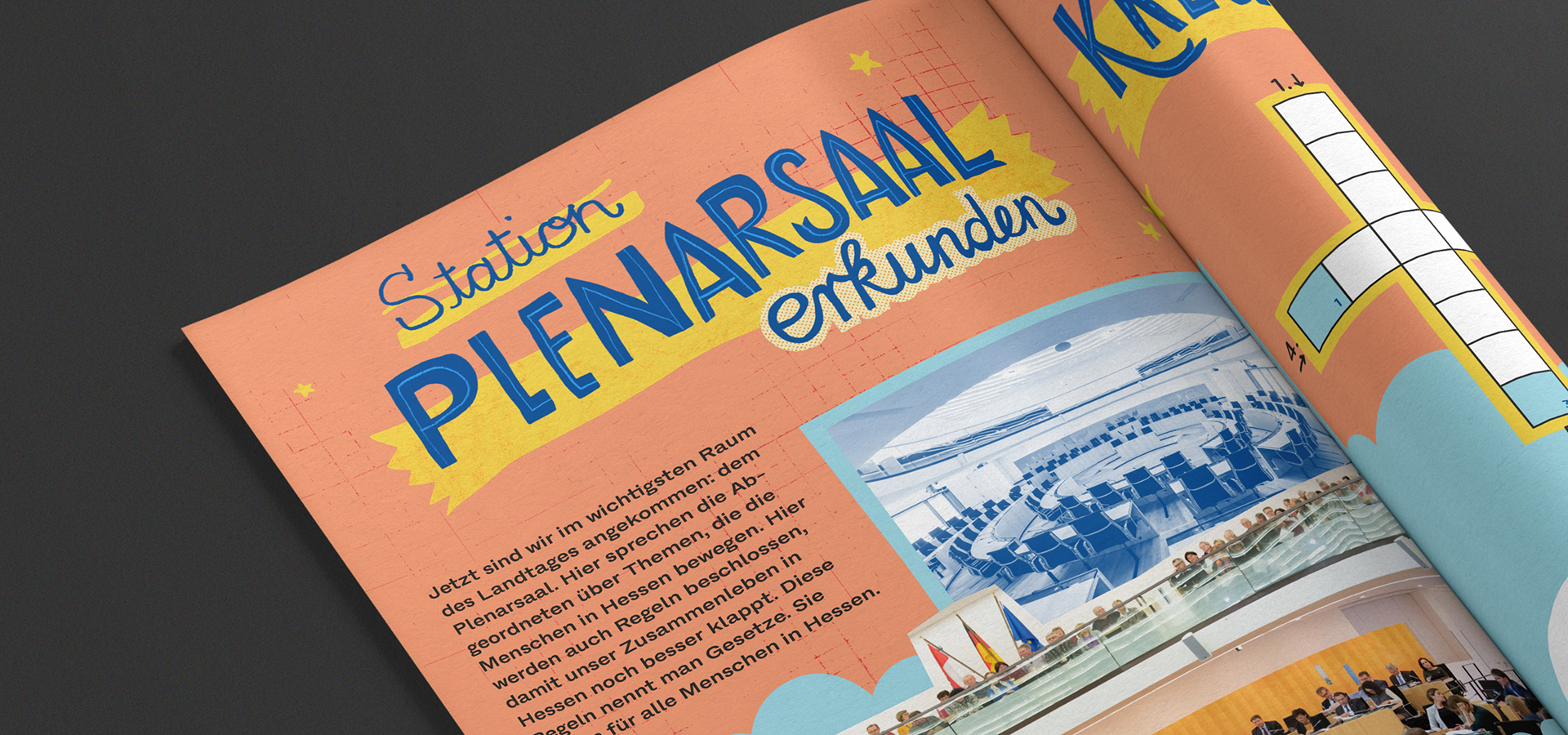 We are expanding the “Leo series” of the Hessian Parliament and adding a researcher’s booklet for the interactive guided tour “Expedition Landtag” to the previous publications. With the explorer booklet, children can go through various stations in the Landtag and solve exciting riddles. For this editorial design, we are not only allowed to develop our character “Leo” further but also to combine the typical Leo letterings, illustrations and collages.