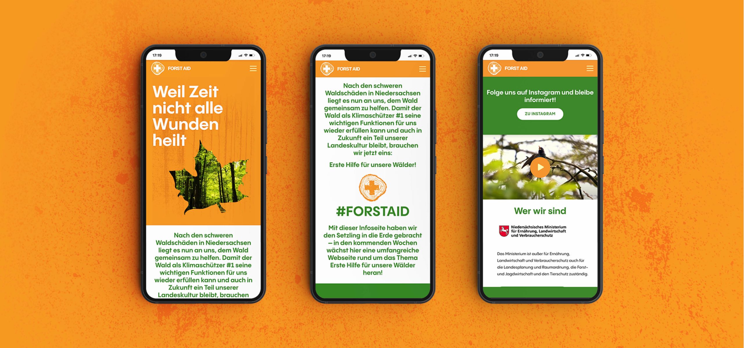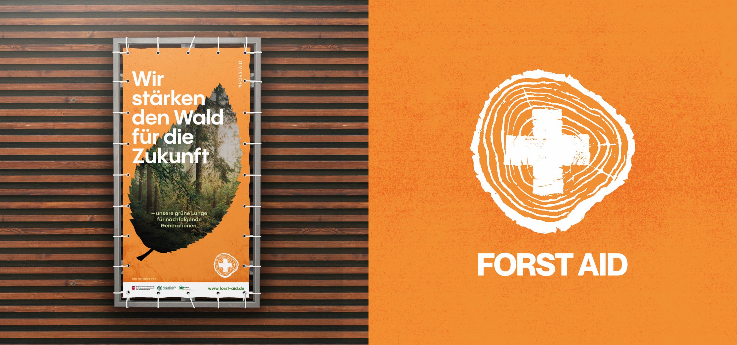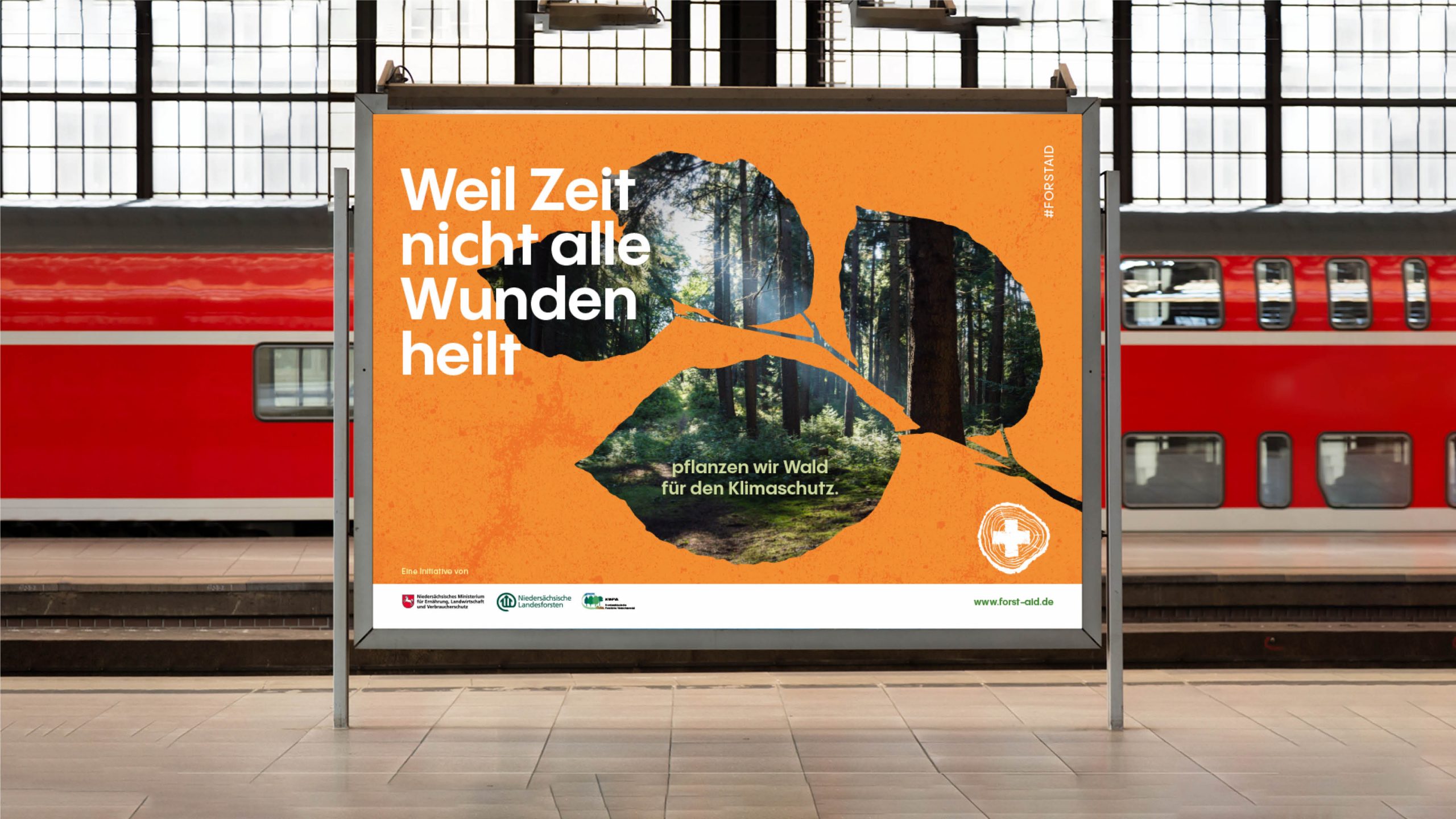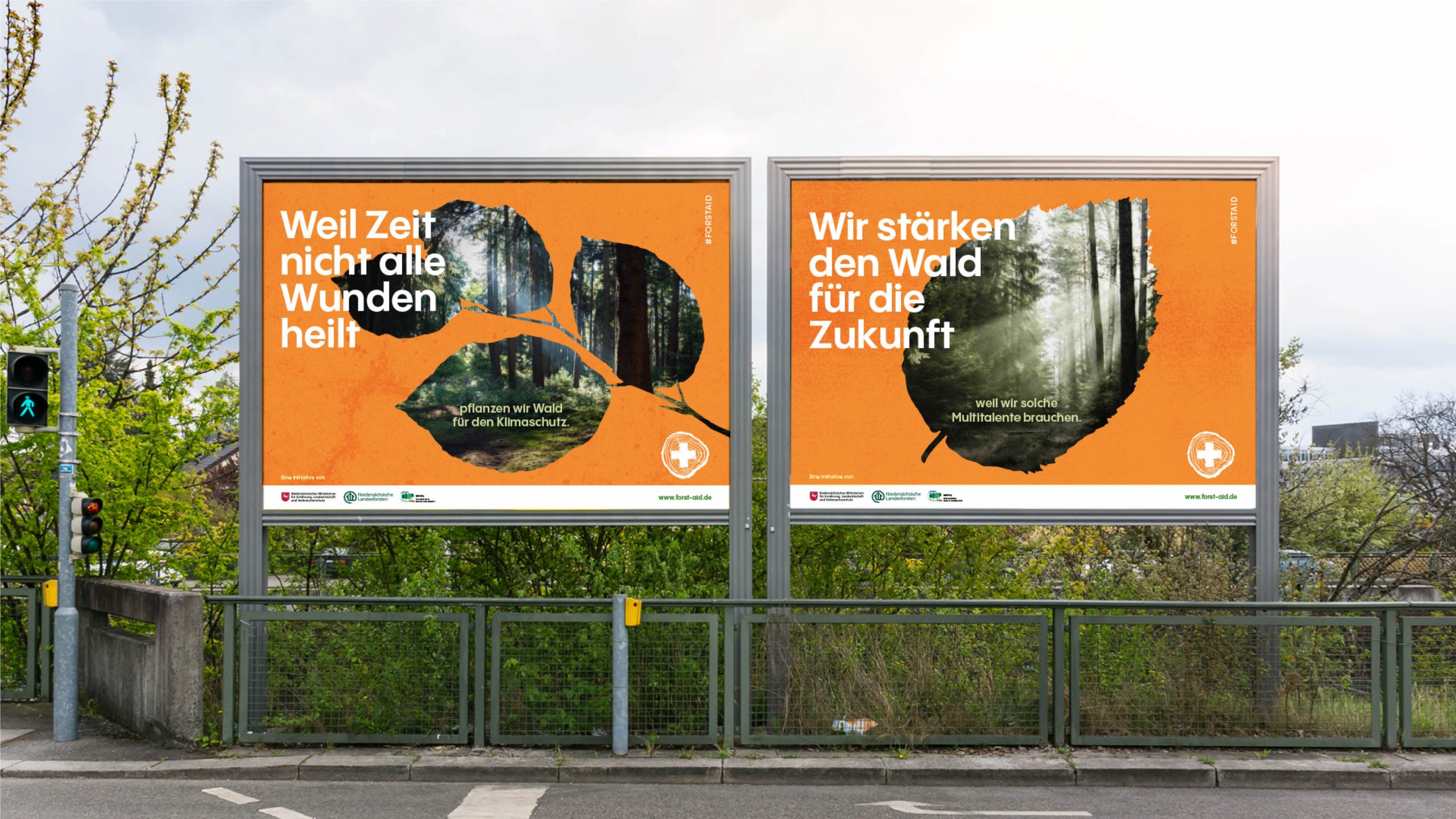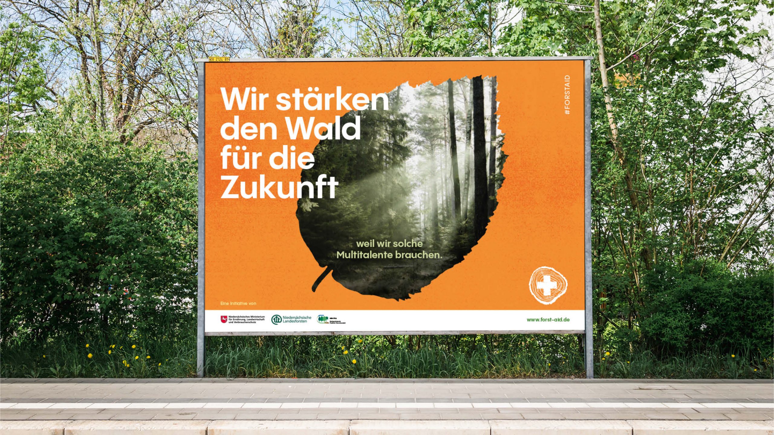 Das Ziel der Reichweitenkampagne „#ForstAid – Erste-Hilfe für unsere Wälder“ ist es, diverse Kernbotschaften gebündelt zu kommunizieren. Die Sensibilisierung und Informationsverbreitung erfolgt neben OOH-Plakaten, Fahrgastfernsehen und einer Bus-Plakatierung in Hannover crossmedial über die Kampagnen-Webseite und Social Media. Visuell und textuell setzen wir auf das Thema Erste Hilfe, um eine greifbare Assoziation zur Waldrettung und Wiederbewaldung aufzurufen. Wir gestalten das komplette Kampagnen-Design von der Ausarbeitung des Logos bis zur Gestaltung und Umsetzung der Kampagnen-Webseite.