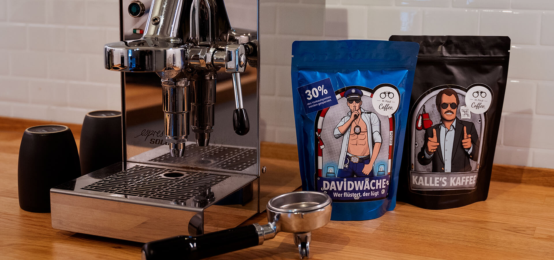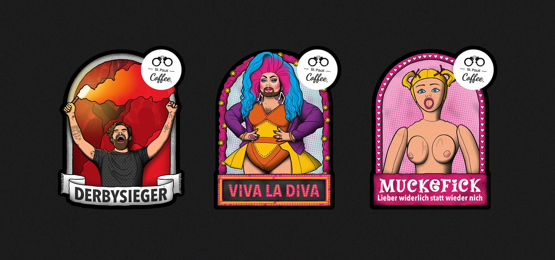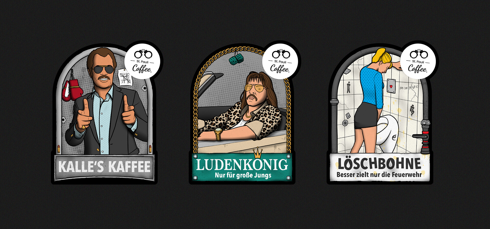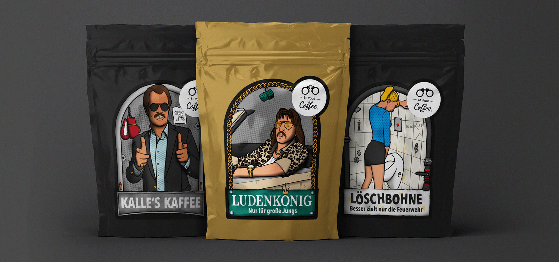 Wir unterstützen die St. Pauli Coffee GmbH beim Upgrade ihres Packagings und gestalten für ihr fair gehandeltes Kaffeebohnen-Sortiment neun individuelle Illustrationen inkl. einer Weihnachtsedition. Die Stilistik der Illustrationen spiegelt den typischen Reeperbahn-Vibe wider und zieht sich wie ein roter Faden durch alle Sorten. Neben der Gestaltung der Etiketten modifizieren wir leicht das Logo der Kaffee-Brand. Mit den Sorten „Davidwache“, „Clochard“ und „Löschbohne“ unterstützen unsere Nachbarn soziale Projekte wie die Obdachlosenhilfe.